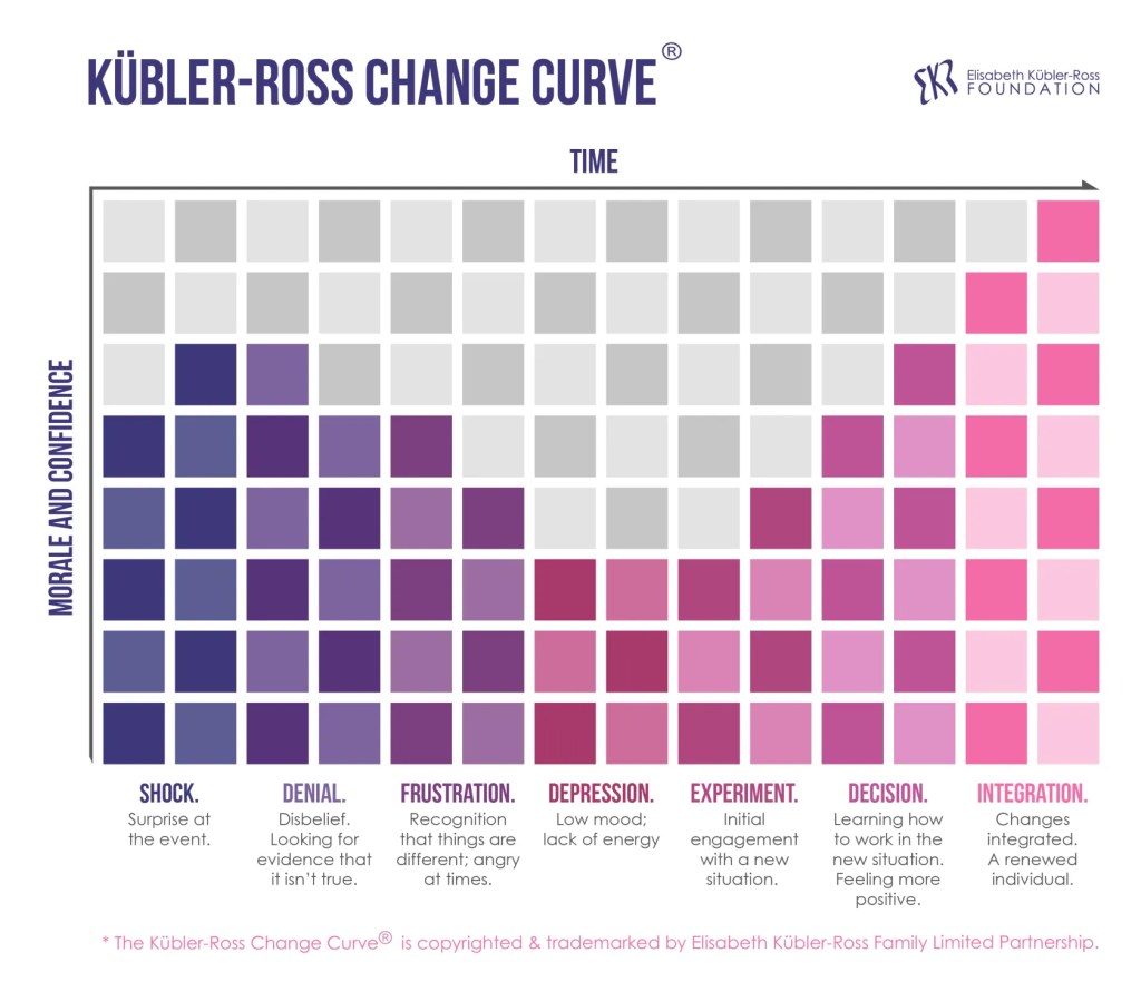 Change is hard for nearly everyone, so embrace it and know it’s all part of your growth. Give yourself grace to move through Kubler-Ross Change Curve.