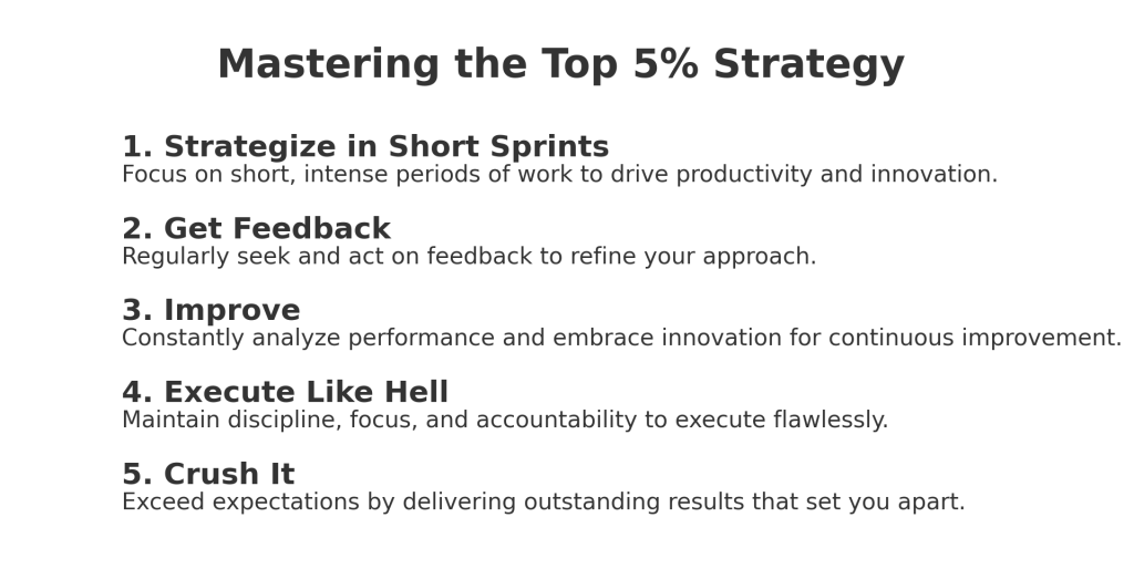 By adopting a strategy of short sprints, continuous feedback, relentless improvement, disciplined execution, and aiming to “crush it,” you position yourself to achieve and sustain top 5% performance. This iterative, focused approach not only drives immediate results but also fosters a culture of excellence and innovation, ensuring long-term success in an ever-evolving business landscape.